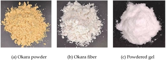 Rice starch was obtained from a commercial supplier (Cho Heng Rice Vermicelli Factory Co., Ltd., Nakhon Pathom, Thailand), with an amylose content of at least 23%. Fresh okara was sourced from a local tofu/soymilk manufacturer (NGOWJENGNGOUN Co., Ltd., Bangkok, Thailand), then tray-dried at 60 °C until the moisture content fell below 10%, ground into powder, and sieved through a 100-mesh sieve. The resulting okara powder used in this study contained 4.33% moisture, 29.35% protein, 12.85% fat, 1.28% soluble dietary fiber (SDF), and 36.93% insoluble dietary fiber (IDF), corresponding to a total dietary fiber content of 38.21% on an as-is basis (Figure 1a).