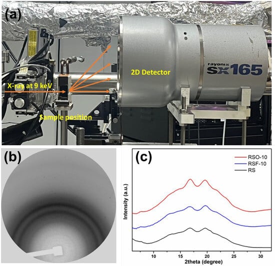 Figure 3. WAXS experimental setup and representative results: (a) schematic of the WAXS experimental setup at BL1.3W, SLRI, Thailand; (b) two-dimensional scattering pattern of RSF-10; (c) overlay of 1D WAXS intensity profiles for RS, RSO-10, and RSF-10, highlighting the impact of okara and dietary fiber addition on diffraction intensity and peak characteristics.
