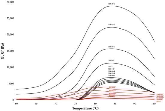 The rheological behavior of rice starch gels was significantly influenced by the incorporation of whole okara and extracted dietary fiber (DF), revealing compositional and structural modifications in gelation and viscoelasticity. The temperature sweep data indicated that the gelation temperature (Tc) of rice starch (RS) was 75.3 ± 0.12 °C, decreasing to approximately 66.7 °C in all RSO samples and further to 59.6 °C in RSF samples. This trend aligns with reports that fiber inclusion promotes early amylose aggregation by altering hydration dynamics and promoting phase separation [17,31]. In high-amylose starch systems (~23% amylose in this study), such early aggregation facilitates the formation of denser gel networks during cooling and storage [11].