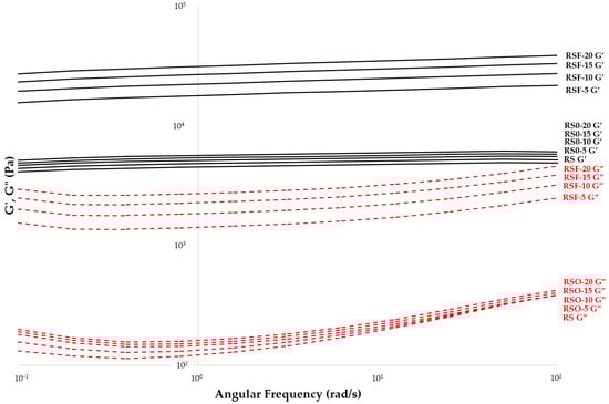 Figure 5. Frequency sweep profiles of rice starch (RS), RS–okara (RSO), and RS–dietary-fiber (RSF) gels. G′ and G″ plotted across an angular frequency range of 0.1–100 rad/s at 25 °C. All samples demonstrated stable gel-like behavior (G′ > G″). RSF gels showed significantly higher G′ values, indicating stronger network structures.