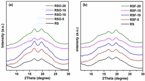 As shown in Figure 7, fiber addition influenced crystallinity percentages across treatments. Crystallinity slightly increased at low okara levels (RSO-5 and RSO-10), then decreased at higher levels (RSO-15), while RSF samples generally maintained or slightly enhanced crystallinity, peaking at 17.35% in RSF-20. These patterns suggest altered molecular packing and localized ordering due to fiber interactions.