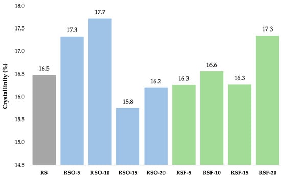 Both RSF and RSO blends exhibited broader and less intense peaks than RS alone (Figure 6), indicating the disruption of long-range crystalline order. Crystallinity values (Figure 7) slightly increased with the addition of low-to-moderate levels of okara (RSO-5 and RSO-10) but decreased at higher substitution levels (RSO-15), suggesting alterations in molecular ordering within the monoclinic lattice rather than changes in polymorph type. In contrast, RSF treatments maintained or slightly enhanced crystallinity, with RSF-20 reaching 17.35%, higher than RS (16.48%). Notably, while peak broadening and intensity changes suggest a loss of structural coherence, they do not indicate a polymorphic transition, but rather reflect molecular-level disruptions within the A-type lattice.