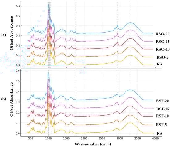 Figure 8. (a) FTIR spectra of rice starch gels incorporated with whole okara (RSO) at 5–20% substitution levels (w/w, dry basis). (b) FTIR spectra of rice starch gels incorporated with extracted dietary fiber (RSF) at 5–20% substitution levels (w/w, dry basis). Spectra are vertically offset for visual clarity; relative absorbance intensities remain unaltered. Sample names are labeled directly beside each spectrum. Enhanced O–H stretching (3280–3296 cm−1) and ester carbonyl (C=O) stretching (~1745 cm−1) were observed in modified samples. Differences in molecular interactions and structural ordering are evident in the fingerprint region (1200–900 cm−1). Horizontal reference lines assist visual comparison across treatments.