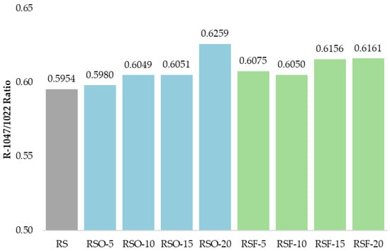 In the fingerprint region (1200–900 cm−1), which encompasses the skeletal vibrations of polysaccharide backbones, the peak near 995 cm−1—often associated with the helical order of starch—remained visible across all treatments. Two key bands at 1047 cm−1 and 1022 cm−1 were selected to calculate the absorbance ratio R1047/1022, frequently used as an empirical indicator of short-range molecular order in starch systems. As summarized in Figure 9, this ratio increased across all fiber-containing samples relative to the RS control (0.5954), with the highest values observed in RSF-20 (0.6161) and RSO-20 (0.6259).