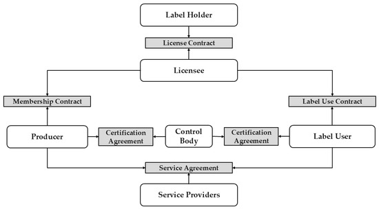 Schematic overview of the certification system of the state-led regional label of Baden-Württemberg. Shaded boxes denote the various contractual relationships between actors; unshaded boxes represent the stakeholders involved in the system. Adapted from the Ministry of Nutrition, Rural Areas and Consumer Protection of Baden-Württemberg [30].