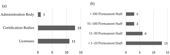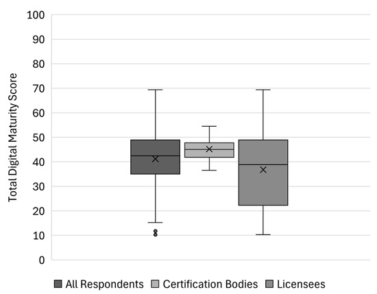 The present study evaluated the digital maturity of organisations involved in the administrative processes of food certification within Baden-Württemberg. To achieve this objective, all relevant organisations were identified, encompassing a total population of 43 organisations. These organisations include both certification bodies and licensees within the QZBW and BIOZBW certification systems. A list is publicly available on the MLR website and includes contact details [67]. The list of licensees contains 28 organisations, and the list of certification bodies contains 16 organisations. Notably, one organisation operates in a dual capacity, functioning as both a licensee and a certification body. For analytical consistency, this entity was counted in the total population as a single unit, resulting in a total of 43 unique organisations involved in the administrative processes. However, this organisation did not participate in the survey, and therefore, its dual role is not reflected in the survey results. Furthermore, there are instances where two organisations operate under the same administrative structure, sharing personnel and resources; these were also considered as a single entity. Regarding the specific certification systems, 36 organisations are involved in the QZBW system, while 17 organisations participate in the BIOZBW system. Ten organisations are involved in both systems.
