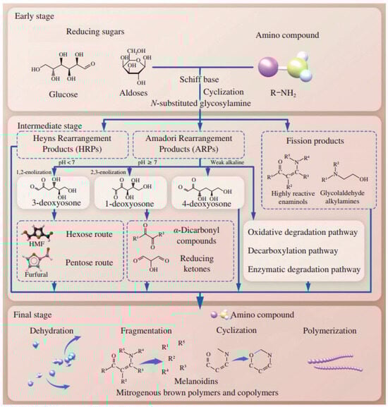 The stability of MRPs is also influenced by multiple factors, including pH, temperature, and humidity. Among these, pH plays a crucial role. At high pH values, MRPs can undergo hydrolysis or oxidation, leading to the formation of harmful metabolites [10]. Additionally, pH affects the types of volatile organic compounds (VOCs) generated during the Maillard reaction. It has been observed that pH has a greater impact on the formation of pyrazine derivatives than on pyrrole and pyridine derivatives. An alkaline environment particularly favors the production of nitrogen-containing heterocyclic VOCs [46].