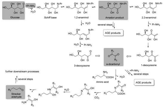 Simplified Maillard reaction between glucose, a reducing sugar, and an amine group of a protein to form a Schiff base, which can rearrange to an Amadori product; in the case of ketoses, it can also rearrange into a Heyns product via an 1,2-enaminol. Through enolization, the Amadori product leads to 1,2-enaminol or 2,3-enaminol and forms deoxyosones, α-dicarbonyl compounds. These can rapidly react rapidly with other nucleophiles to form Strecker aldehydes. Some of the Maillard reaction intermediates can generate AGEs (advanced glycation end-products) [2].