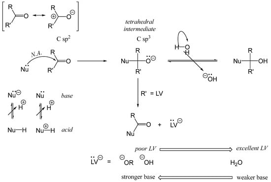 Early stage of Maillard reaction: nucleophilic addition. Addition of a nucleophile (Nü), a Lewis base, on a carbonyl, RR’C=O. LV: leaving group. In Maillard reaction, water (H2O) is the leaving group.