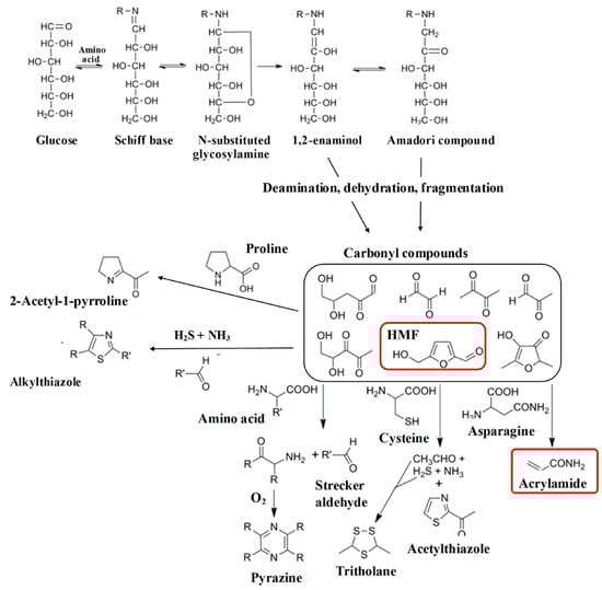 A simplified illustration of the Maillard reaction showing the formation of acrylamide, HMF in red, and other byproducts, many of which contribute to the taste and scent of fried, baked, roasted, and toasted foods. The subsequent deamination, dehydration, and fragmentation of these compounds generate highly reactive carbonyl compounds, including HMF. These can further interact with free amino acids, resulting in a diverse array of products [30].