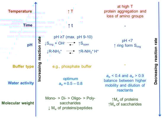 Key factors influencing the rate of the Maillard reaction. The reaction rate is modulated by several parameters, including temperature, time, pH, buffer type, water activity (aw), and molecular weight of reactants. Reaction acceleration is generally observed with increasing temperature and time, alkaline pH (≥7), moderate water activity (0.5–0.8), and the use of phosphate buffers. Low molecular weight carbohydrates and peptides also favor faster reaction kinetics. Conversely, reaction rate decreases under acidic conditions (pH < 7), extreme water activity values (aw < 0.4 or >0.9), and with high molecular weight proteins or polysaccharides. At elevated temperatures, protein aggregation and amino group loss can inhibit reaction progress [34].