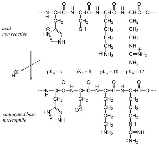 The base form of lateral chain of amino acid residues when the pH is closed (pH > pKa −3), equal or higher to pKa of His, Cys, Lys, Arg residues (left to right).