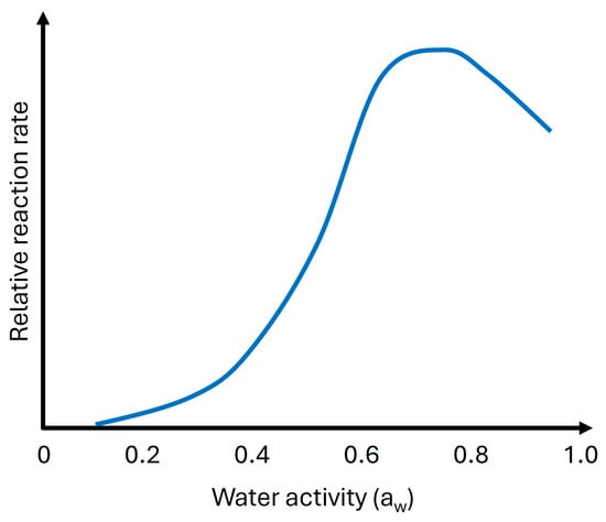 The relationship between water activity and the Maillard reaction is significant in food processing. Water activity influences the rate and color of the Maillard reaction, with a peak reaction rate typically occurring around a water activity of 0.6 to 0.7 (Figure 8). As water activity approaches 0.70, the Maillard reaction and sugar browning accelerate, but beyond this point, the reaction slows due to excessive free water diluting the reactants [64].