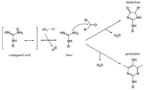 Arginyl residues (Arg, R) contain a guanidino group (H2N–C(=NH)–NH–R) and can participate in nucleophilic addition reactions which have been rarely described. This is mainly because the pKa value of the guanidinium group is very high, and the typical pH range of food systems (pH 5–7) is far from this value. The pKa of the guanidinium group in free arginine is approximately 13.8 [80]. In reality, the pKa of arginyl residues in proteins depends on the specific position of the residue within the protein structure and the local electronic microenvironment, with reported pKa values ranging from 11.5 to 15.0. A commonly accepted average pKa value is around 12 [81].