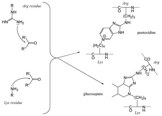 The MRPs involving arginyl residues include advanced glycation end-products (AGEs) and advanced lipoxidation end-products (ALEs), formed through reactions with carbonyl groups from lipid oxidation products. These include structures such as imidazolone and pyrimidine (Figure 10). Additionally, arginine and lysine residues can be cross-linked through the formation of compounds like pentosidine or glucosepane, leading to protein crosslinking, as illustrated in Figure 11 [82].