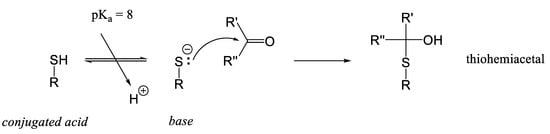 The pH value has a major impact on the kinetics of the Maillard reaction, as only the basic forms of functional groups—guanidino groups (H2N–C(=NH)–NH–R), secondary amino groups (R–NH–R’), primary amino groups (R–NH2), and thiolate groups (R–S−)—act as nucleophiles (Lewis bases, Nü) (Figure 1). The lower the pH, the lower the proportion of nucleophiles available, and thus the slower the reaction rate. The pKa value of sulfhydryl/thiolate groups in proteins is typically between 8 and 9 (R–SH ⇌ H+ + R–S−), while the pKa value for ammonium/amino groups is generally around 10 (R–NH3+ ⇌ H+ + R–NH2). At pH values below 6, the rate of the Maillard reaction is very low.