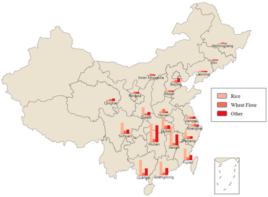 In recent years, studies on Cd contamination in processed grain products have been conducted in different countries, such as Bangladesh [16], Ecuador [17], India [2], etc. Rice is a staple food in China, leading to much higher consumption compared with other regions [18]. Given the relatively serious Cd pollution in some regions of China, the distribution and concentration of Cd in rice grains have been widely studied in China. Yang [19] assessed the pollution situation of Cd in wheat grains from the major wheat-cultivation areas of Baoji, a typical agricultural area in Shaanxi, and the dietary health risks caused by consuming wheat grains [20]. The results show that the mean grain concentration of Cd is 0.01 mg/kg, which is remarkably lower than the tolerance limits of the Chinese food hygiene standard (GB 2762-2017 [14]). In addition, there are studies of grain-growing areas with known industrial pollution sources [10], wastewater input fields, and typical farmland [21]. In these studies, risk assessment of heavy metals in grain processing products is conducted in certain areas without estimating the health risk of Cd from grain consumption. Meanwhile, most of these studies use small amounts of detection data. Although there are a few studies that perform assessments with larger amounts of nationwide data [22], they provide no results on smaller scales, e.g., urban areas. Given the demand to assess Cd contamination in grain processing products in China, we perform a municipal food safety risk assessment nationwide using national sampling detection data released by the State Administration for Market Regulation.