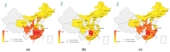 It can be seen from Table 2 and Figure 2 that, for NIPI, rice (3.2056, 3.03147) in Hunan province and Jiangxi province and other processed grain products (3.14788) in Sichuan province located in south of China are relatively high (see Figure 2a,g), whereas NIPI in wheat flour are relatively low and the highest value is in Guangdong province (0.71388), while some central provinces such as Henan and Hebei also have higher NIPI values (see Figure 2d). Regarding TCR, in rice, eight provinces have TCR values above 10−4, and all of them are located in southern China, with the highest value of 0.00856 in Hunan province 268 (see Figure 2b); in wheat flour, half of the provinces have TCR values above 10−4, and only Henan and Liaoning provinces are located in northern China, with the highest value of 0.00319 in Henan (See Figure 2e). Similarly, in other processed grains, the provinces with TCR values above 10−4 are Hunan (0.00623), Jiangxi (0.00428), and Guangxi (0.00157) located in the south of China and Qinghai (0.00120) located in the north of China (See Figure 2h). As for THQ, half of the provinces have a THQ value above 1 in rice, and most of these provinces are in the south of China (See Figure 2c), with the exception of Henan and Shaanxi provinces, and the highest value is in Hunan province (4.83029), followed by Zhejiang province (2.93829). Similarly, for the other processing grain products, nearly half of the provinces have a THQ value above 1 and all of them, with the exception of Beijing, are in the south of China (See Figure 2i). The highest value is also found in Hunan province, at 5.21521, followed by Guangxi province (2.20096) and Fujian province (2.00143). Regarding wheat flour, however, only wheat flour from Henan province has a THQ value above 1, at 1.23962, while the rest of the provinces are less than 1 (See Figure 2f).