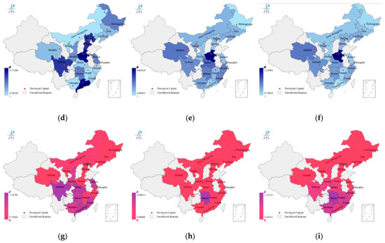 Spatial distribution of health assessment indices for Cd in grain processing products in 20 Chinese provinces and cities over the period 2023–2024. (a) Spatial distribution of NIPI in rice; (b) Spatial distribution of TCR in rice; (c) Spatial distribution of THQ in rice; (d) Spatial distribution of NIPI in wheat flour; (e) Spatial distribution of TCR in wheat flour; (f) Spatial distribution of THQ in wheat flour; (g) Spatial distribution of NIPI in other processing product; (h) Spatial distribution of TCR in other processing product; (i) Spatial distribution of THQ in other processing product.