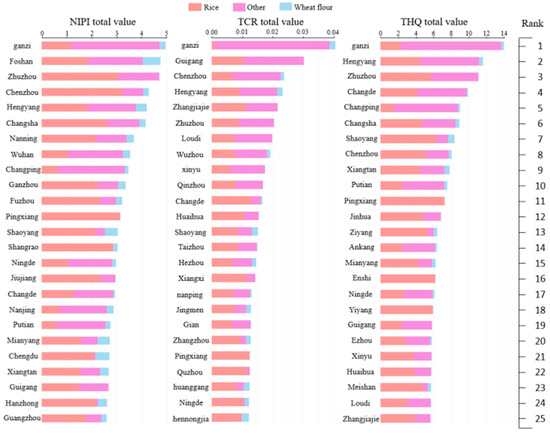 We calculate the total NIPI, TCR, and THQ for these products across various cities, with part of the results presented in the figure. As seen in Figure 3, Ganzi City in Sichuan Province has the highest total NIPI, TCR, and THQ values, indicating a significant health risk due to Cd contamination. Other cities with high-risk values, such as Chenzhou, Zhuzhou, and Hengyang, are primarily located in southern provinces like Jiangxi, Hunan, and Sichuan. These areas show elevated contamination levels, largely due to higher Cd concentrations in rice and other grain products compared with wheat flour.