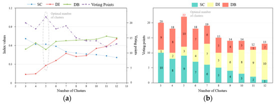 (a) Evaluation of three cluster index values; (b) evaluation of three cluster index values voting points of k-means++ clustering. The optimal number of clusters is 5.