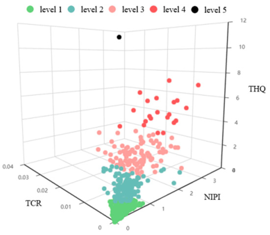 In contrast with the traditional risk classification method of dietary exposure assessment, the risk classification model allows us to consider the combined effects of three indices (see Figure 5) in a comprehensive and objective manner. Regarding the three indicators in our model, we use THQ to characterize the risk of non-carcinogenic dietary intake for dietary exposure assessment, and TCR to characterize the risk of chronic dietary intake, combined with the NIPI to consider the need for a comprehensive evaluation of risk management to some extent. However, the classification results just show the relative risk of health hazards, and do not reflect the absolute risk. Therefore, the combinations with risk levels 3, 4, and 5 mainly indicate the priority of concern.