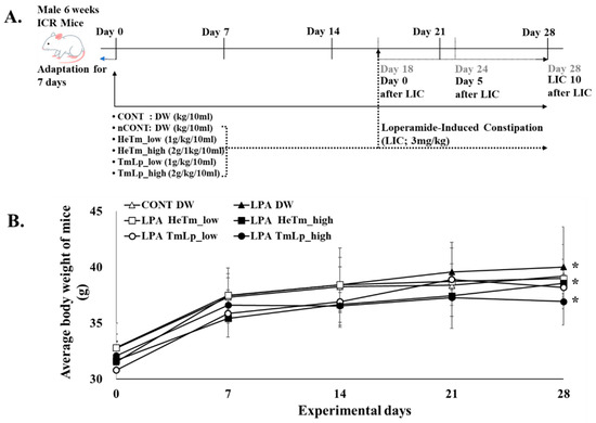 Experimental design and the body weight change in loperamide-induced constipated Institute of Cancer Research (ICR) mice. (A) Schematic diagram of the experimental protocol. After a 7-day acclimation period, test samples—non-fermented T. molitor hydrolysate (HeTm) and fermented hydrolysate (TmLp)—were administered orally once daily for 28 days. Constipation was induced in all groups except the normal control (CONT) by oral administration of loperamide (LPA; 3 mg/kg) once daily during Days 18 to 28. (B) Body weight changes were monitored weekly throughout the 28-day experimental period. Data are presented as the mean ± standard deviation (SD) (n = 5 per group). Asterisks indicate statistically significant differences compared to the control group (* p < 0.05).