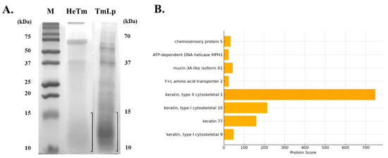 SDS-PAGE and peptide profile of T. molitor protein hydrolysates. (A) SDS-PAGE analysis was conducted using a 15% gel to compare the protein profiles of HeTm (lane 1) and TmLp (lane 2). M represents the molecular weight protein marker. The boxed region indicates the gel section (<15 kDa) excised for LC-MS/MS analysis. (B) Bar graph showing the top peptides identified in the TmLp group based on LC-MS/MS analysis (Table 1). The protein score reflects the confidence and abundance of peptide identification, with keratin, mucin-3A-like, and chemosensory proteins being the most prominent.
