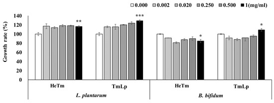 Evaluation of the growth-promoting efficacy of fermented T. molitor hydrolysate (TmLp) and non-fermented hydrolysate (HeTm) on beneficial intestinal bacteria, L. plantarum (KCTC 21024) and B. bifidum (KCTC 3202). Bacterial cultures (5 × 105 CFU/mL) were incubated with varying concentrations (0.002, 0.02, 0.25, 0.5, and 1 mg/mL) of HeTm or TmLp for 24 h. PBS was used as a control. Bacterial growth was measured at 600 nm. Data are presented as the mean ± SD (n = 3). Asterisks indicate statistically significant differences between the experimental groups and the control (* p < 0.05; ** p < 0.01; *** p < 0.001).