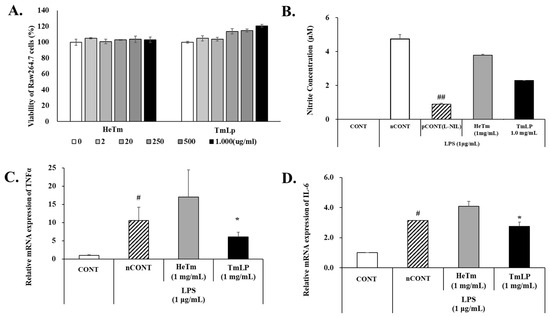 RAW 264.7 mouse macrophages (ATCC, Manassas, VA, USA) were cultured in DMEM (Gibco, Waltham, MA, USA) with 10% FBS and 100 U/mL penicillin/streptomycin (Gibco, USA) at 37 °C in 5% CO2. RAW 264.7 cells were seeded at a density of 1 × 105 cells/mL. A total of 200 μL of the cell suspension (equivalent to 2 × 104 cells/well) was added to each well of a 96-well plate and incubated for 24 h. Media were replaced with fresh media containing HeTm and TmLp at final concentrations of 0, 2, 20, 250, 500, and 1000 μg/mL. After a 24 h incubation, cytotoxicity was evaluated using the EZ-Cytox kit (Dogenbio, Republic of Korea). Absorbance was measured at 540 nm using a SpectraMax ABS microplate reader (Molecular Devices, San Jose, CA, USA), and cell viability was expressed relative to that of the untreated control.