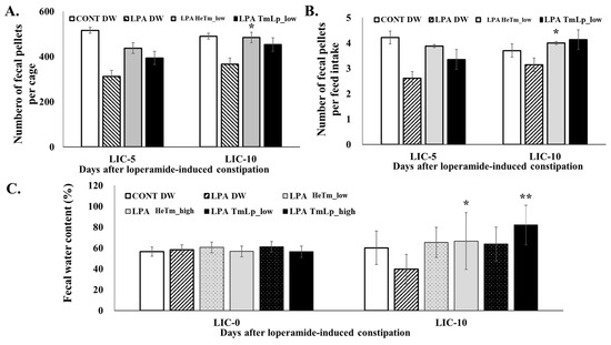 Evaluation of dietary intervention effects on LPA-induced constipation. (A) Fecal pellet count per cage (A), fecal pellets per unit of feed intake (B), and fecal water content (C) in experimental mice administered the interventions for 10 consecutive days. LIC-0, 5, and 10 = days after loperamide-induced constipation. Data are presented as the mean ± SD (n = 5 per group). Asterisks indicate statistically significant differences compared to the control group (* p < 0.05; ** p < 0.01).