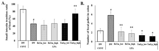 Intestinal transit time assessment and charcoal meal experiment. (A) Small intestine transit rate after oral administration of a 3% charcoal meal on ten consecutive days. (B) Number of charcoal-stained fecal pellets collected from the colon following the sacrifice of experimental mice. Data are presented as the mean ± SD (n = 5 per group). Hashtags indicate statistically significant differences between the experimental groups and the control and negative control groups (# p < 0.05). Asterisks indicate statistically significant differences between the experimental groups and the control and experimental groups (* p < 0.05; ** p < 0.01).