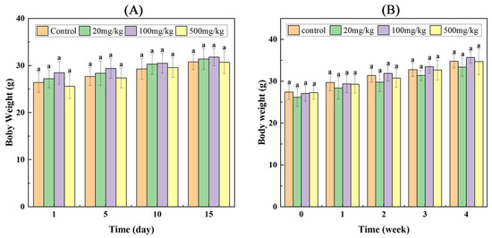 Mean body weights of mice treated with different doses of SNPs/Qc. BW of mice treated by oral toxicity test of SNPs/Qc system for 15 d (A) and 4 w (B). Each value represents the mean of three replicates, and error bars indicate standard deviations (±SD). Lowercase letter (a), in the graph, indicates no significant differences between control and treatment groups at the same administration time (p < 0.05).