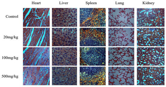 In addition, compared with the control group, the data associated with organ coefficients (Table 1) showed that there was no significant difference (p > 0.05) in the ratios of heart/BW, liver/BW, lung/BW, kidney/BW and spleen/BW of the mice in all of the experimental groups.