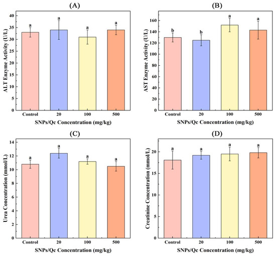 Effects of SNPs/Qc on liver and kidney function in mice. (A) The enzyme activity of ALT (A) and AST (B) in the plasma of mice in the control and administration groups. The content of creatinine (C) and urea (D) in mice in the control and administration groups. Each value represents the mean of three replicates, and error bars indicate standard deviations (±SD). Different lowercase letters (a, b), in the graph, indicate significant differences among four experimental groups at the same administration time (p < 0.05).