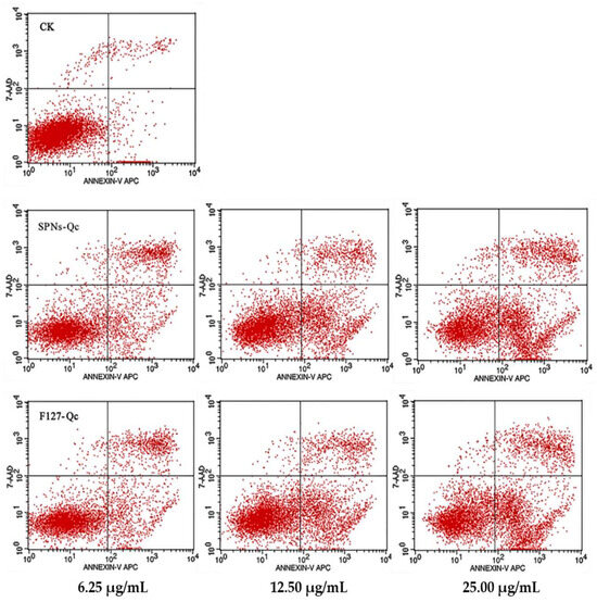 According to the results of cell inhibition experiments (Table S1) [13], 3LL cells were selected as follow-up experimental cells with a higher inhibition rate. In the logarithmic growth phase, 3LL cells were digested and inoculated into six-well plates overnight. After 48 h of SNPs/Qc or F127/Qc treatment, cells were trypsinized and washed with phosphate buffer (PBS). The doses of SNPs/Qc and F127/Qc were 6.25 μg/mL, 12.50 μg/mL and 25.00 μg/mL, respectively. Amounts of 5 μL Annexin V-APC and 5 μL 7-AAD were added to the cell suspension. Stained cells were incubated for about 10 min at room temperature in the dark and analyzed by flow cytometry [26,27].