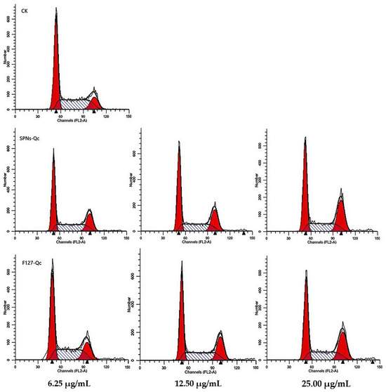 Effects of SNPs/Qc and F127/Qc on the cell cycle of 3LL cells. The red peaks on both sides indicate that cells were in G1 and G2 phases. The middle peak indicates that cells were in the S phase.