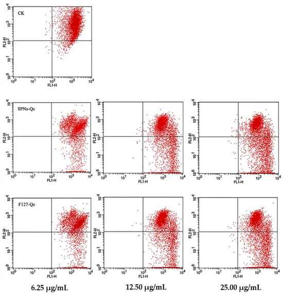 As can be seen in Figure 4, the apoptosis rate of SNPs/Qc groups was significantly higher than that of the control group after administration (p > 0.05). After treatment with 6.25, 12.5, and 25 μg/mL of SNPs/Qc, the apoptosis rates were respectively 21.47 ± 2.93%, 28.78 ± 2.37%, and 37.05 ± 1.91%, in a dose-dependent manner (Table S2).