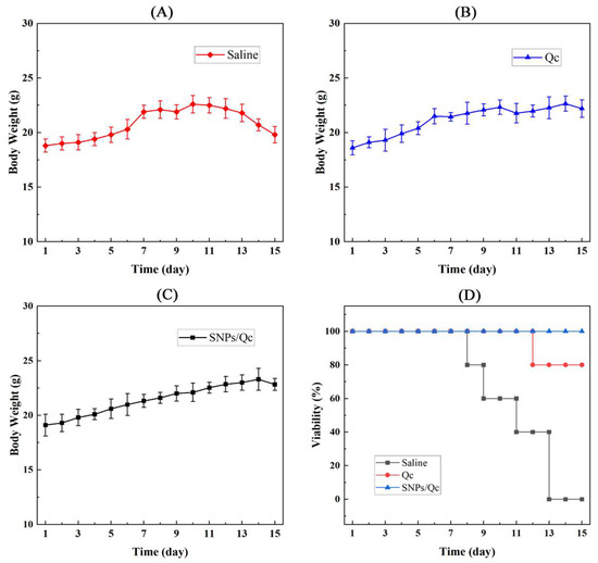 None of the mice in the three groups exhibited abnormal BW (Figure 7). However, the mice in the control lost weight on day 13. The survival time was recorded as 8–13 d in the control. In the Qc group, the survival rate after the experiment was 80%. After 15 d of nanoparticle ingestion, there was no death in SNPs/Qc group (Figure 7D).