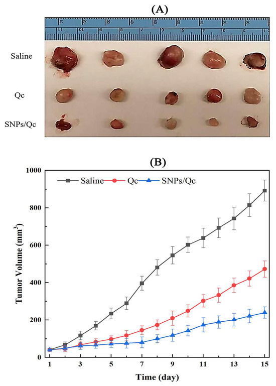 As is shown in Figure 8, the tumor volumes of mice in Qc and SNPs/Qc groups were significantly reduced (p < 0.01) when compared with the control. After 15 d of nanoparticle ingestion, tumor volumes of mice in the control grew to about 892 mm3, while tumor volumes in Qc and SNPs/Qc groups were 472 mm3 and 239 mm3, respectively.