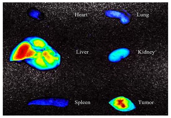 In vivo fluorescence images of organs and the tumor in tumor-bearing mice. Observe the organs, including the heart, kidney, lung, liver and spleen.