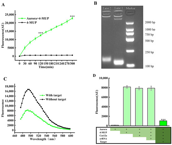 To comprehensively evaluate Aurora’s performance in terms of catalytic activity, stability, and specificity toward the 4-MUP substrate, this study systematically monitored the dynamic changes in fluorescence intensity of the reaction system over a 0–300 min period, as illustrated in Figure 2A. As the reaction progressed, the fluorescence signal exhibited a distinct phasic enhancement pattern: during the initial 0-120 min, the signal increased rapidly (F/F0 = 23.95 ± 0.59) (p < 0.001); after 120 min, the growth rate significantly decelerated but continued to rise, reaching a remarkable 39.62 ± 2.73-fold increase (F/F0) at 300 min (p < 0.001) (where F represents fluorescence measurements under certain conditions and F0 represents initial fluorescence measurements). Notably, in the control group containing only 4-MUP, no significant fluorescence signal variations were observed throughout the monitoring period, an experimental phenomenon that mainly stems from the extremely slow rate of spontaneous decomposition of 4-MUP, which produces almost no detectable fluorescence signal change. This feature effectively avoids the interference of background signals generated by non-enzymatic reactions, enabling us to clearly determine that the observed fluorescence signal changes originate from the catalytic reaction of Aurora rather than from the spontaneous decomposition of 4-MUP, thus effectively eliminating potential false-negative signals that might arise from the spontaneous decomposition of 4-MUP. More importantly, the 4-MU generated through Aurora catalysis exhibited stable fluorescence characteristics during 300 min of continuous observation, without any obvious decay trend, indicating that the generated fluorescent product 4-MU possesses a stable chemical structure. This property provides a reliable signal foundation for the CRISPR-Cas12a detection system and effectively prevents the risk of false positives due to unstable fluorescence signals.