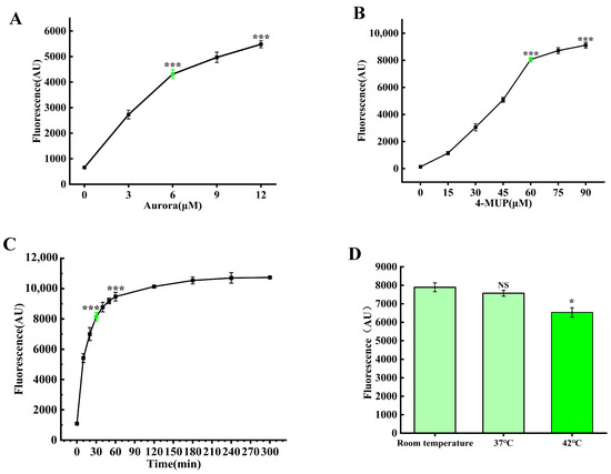 Systematic optimization of critical assay parameters. (A) Determination of optimal Aurora enzyme concentration for maximum detection sensitivity. (B) Evaluation of 4-MUP substrate concentration effects on signal-to-noise ratio. (C) Kinetic analysis of reaction time optimization for Aurora/4-MUP incubation to achieve optimal signal development. (D) Temperature-dependent performance assessment of the Aurora/4-MUP reaction system for maximal detection efficiency. *** p < 0.001, * p < 0.05, NS: not significant (p > 0.05), Student’s unpaired t-test.