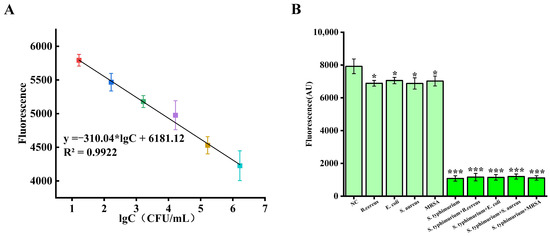 To comprehensively evaluate the detection sensitivity of the system for Salmonella typhimurium, we initially employed national standard methods for precise bacterial enumeration, followed by systematic gradient dilution to establish standardized sample concentrations ranging from 0 to 1.65 × 108 CFU/mL. The RPA-amplified products from these varying concentrations of Salmonella typhimurium DNA were subsequently combined with the optimized detection platform, wherein Cas12a, crRNA, and target DNA formed activated ternary complexes exhibiting efficient trans-cleavage activity, with higher DNA concentrations facilitating rapid activation of more Cas12a-crRNA complexes. Figure S2 displays the fluorescence signal responses from different Salmonella sample concentrations, while Figure 4A presents the quantitative relationship between Salmonella typhimurium concentration and fluorescence intensity. Through these experimental data, we can clearly observe that as Salmonella typhimurium concentration increases, the fluorescence intensity exhibits a systematic decreasing trend. Particularly noteworthy is that within the concentration range of 1.65 × 101–106 CFU/mL, the detection system demonstrates excellent linear response characteristics, with a fitted equation of FI = −310.04 lgC + 6181.12 and a high correlation coefficient of R2 = 0.992. Through precise calculation, the system’s limit of detection reaches 1.29 CFU/mL (based on LOD = 3 × SD/slope, where SD represents the standard deviation of the blank control group, and slope represents the gradient of the standard curve). This exceptional sensitivity convincingly demonstrates that the detection platform can reliably detect trace amounts of Salmonella, providing powerful technical support for pathogen detection at ultra-low concentrations in the field of food safety.