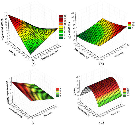 Response surfaces for (a) water content, (b) fat content, (c) sensorial color, and (d) Delta E.