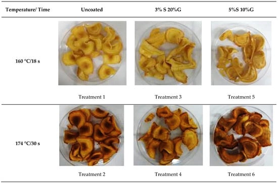 To evaluate the quality of the coated snacks, they were subjected to consumer experience testing by scoring the global acceptability, shininess, color, flavor, and texture (Table 4). In general, there was no statistically significant effect for time and temperature; therefore, those factors do not affect the snack’s quality as expected because of the optimization of the frying conditions prior to the coating treatments. However, the undercoated snacks in treatment 2 (174 °C/30 s) displayed a significant difference in global acceptability, shininess, and color, with the lowest scores. These results could be related to the darker color, as observed by Hua et al. [29], whose work showed that potato chips without a golden color presented the lowest scores. Hence, the results confirm the hypothesis that coatings help to improve the attributes of fried products.