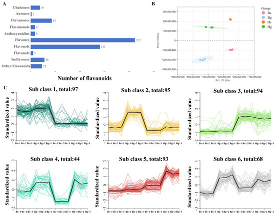 Analysis of the flavonoid metabolism spectrum. (A) The number of flavonoid metabolites; (B) PCA analysis (Hg: the disk flowers of HJ06; Hs: the ray flowers of HJ06; Bs: the disk flowers of BHYJ; Bg: the ray flowers of BHYJ); (C) K−means cluster analysis of the DAMs (The different subclusters are separated by different colors, sub class represents the cluster number of compounds with the same trend, and the number after total indicates the number of compounds in the cluster).