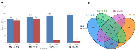 Differential metabolite analysis of flavonoids. (A) Differential accumulation diagram (Hg: the disk flowers of HJ06; Hs: the ray flowers of HJ06; Bs: the disk flowers of BHYJ; Bg: the ray flowers of BHYJ); (B) Venn diagram.