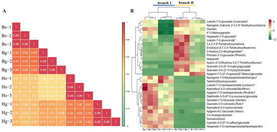 Comprehensive analysis of flavonoids. (A) Pearson correlation analysis of all sample metabolites; (B) 30 types of flavonoids identified in flavonoid biosynthesis pathways (* indicates the compounds’ identification level was Level).