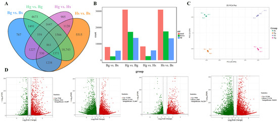 A total of 861 common differentially expressed genes (DEGs) were identified across the Bs, Bg, Hs, and Hg samples (Figure 5A). In the bar graph, significantly differentially expressed genes are highlighted in red (upregulated) and blue (downregulated), as shown in Figure 5B. Principal component analysis (PCA) revealed distinct clustering patterns, with Hs, Hg, Bs, and Bg forming separate clusters, indicating significant differences among them (Figure 5C). Furthermore, the volcano plot visualizes differentially expressed genes (DEGs), with red indicating upregulation and green indicating downregulation, as shown in Figure 5D.